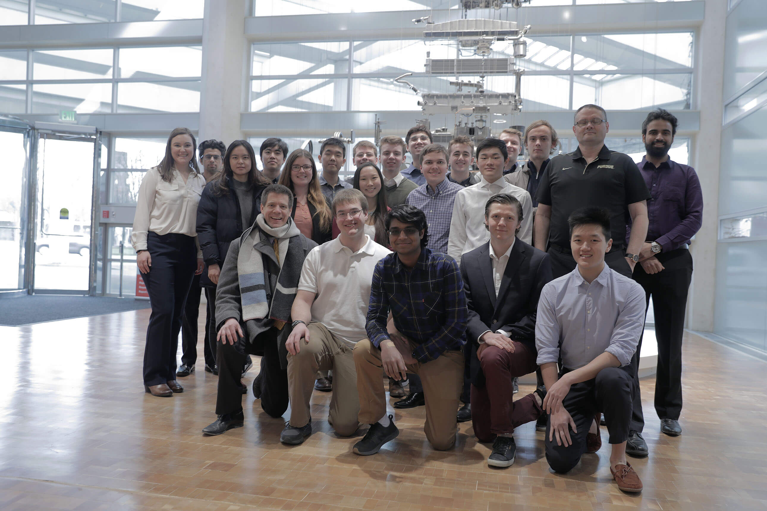 Mark Daniel Ward (first row, far left) and students from The Data Mine visit Cummins in Columbus, Ind., on March 4, prior to social distancing. Fifteen students currently are working on a data science project with Cummins. (Matthew Kerkhoff/Purdue University)