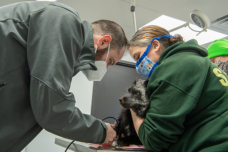 fulkerson-joker Dr. Chris Fulkerson, clinical assistant professor of veterinary medical oncology, treats Joker, a silver-phased red fox, at the Purdue University Veterinary Hospital. (Purdue University photo/John Underwood) Download image