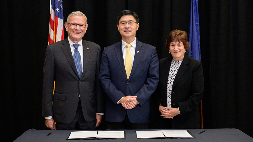 Leaders from Purdue University and the U.S. Department of Energy’s Argonne National Laboratory on Monday (Sept. 9) signed a memorandum of understanding to promote collaborative research between Purdue and Argonne in areas of common scientific and technical interest. Those areas include microelectronics, quantum information science, materials science, nuclear science and engineering, computing, and energy storage materials and recycling. The signing took place in advance of a full-day conference on Purdue’s campus hosted by the Council of Competitiveness that convened leaders from academia, industry and government to continue to advance innovation in chips, qubits and molecules in the Indiana-Illinois Innovation Corridor.
