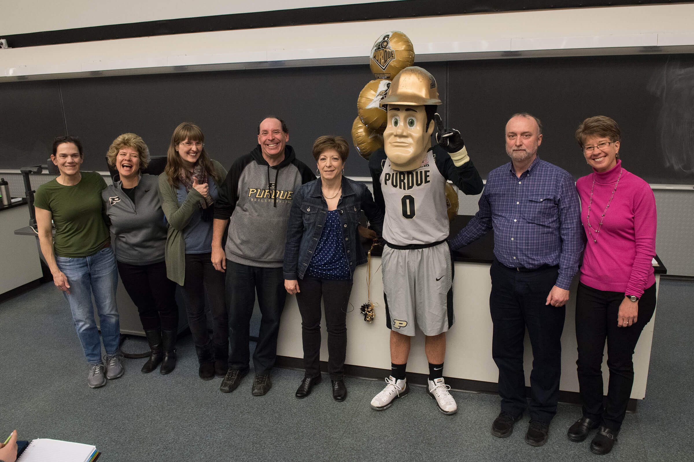 (From left) Jeanne Meyer, undergraduate preparations lab director; Marcy Towns, professor of chemistry; Franziska Lang, visiting assistant professor; Paul Wenthold, associate professor of chemistry; Cindy Harwood, recipient of the Excellence in Instruction Award for Continuing Lecturers; Purdue Pete; John Harwood, director of Purdue Interdepartmental NMR Facility; and Marybeth Miller, instructional specialist. (Purdue University photo/John Underwood)