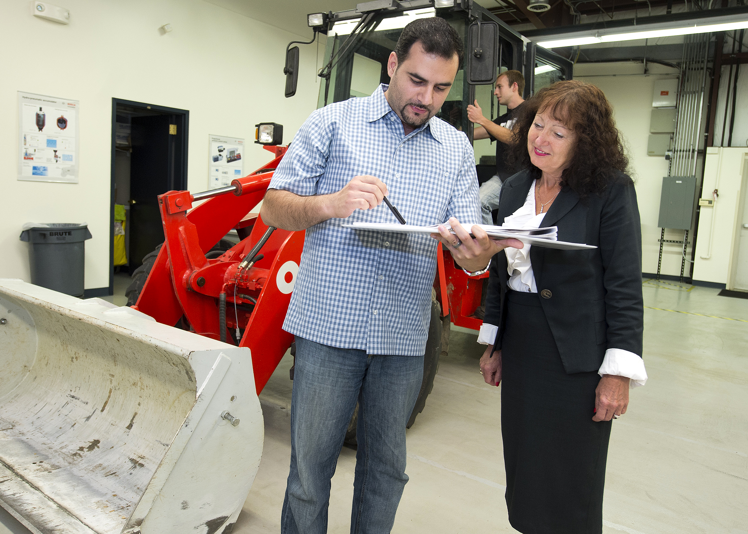 Purdue University professor Monika Ivantysynova and doctoral student Naseem Daher discuss research related to a new hydraulic-steering technology, while graduate student Michael Sprengel looks over the electronic controls of a front loader. Researchers led by Ivantysynova, the Maha Fluid Power Systems Professor, have shown how to reduce fuel consumption while dramatically improving the efficiency of hydraulic steering systems in heavy construction equipment. (Purdue University photo/Mark Simons) |