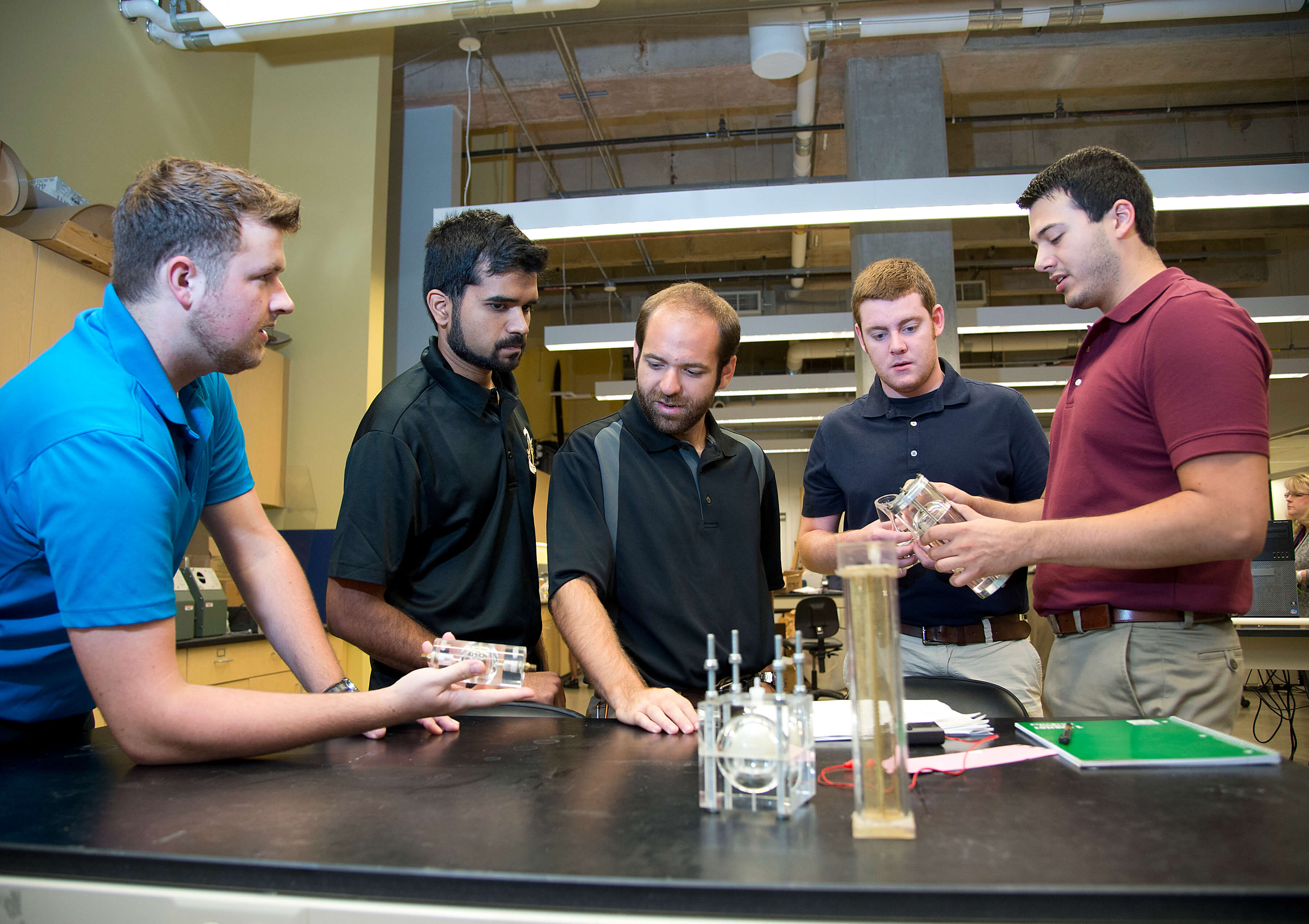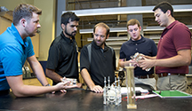 Purdue students (from left) Ben Tackett, Siddharth Tripathi, Jordan Nykiel, Brian McGuire, and Andrew Melgar, are taking a Zero-Gravity Flight Experiment course, creating an experiment to study a new green propellant that could replace the traditional but highly toxic hydrazine fuel. (Purdue University photo/Mark Simons) |