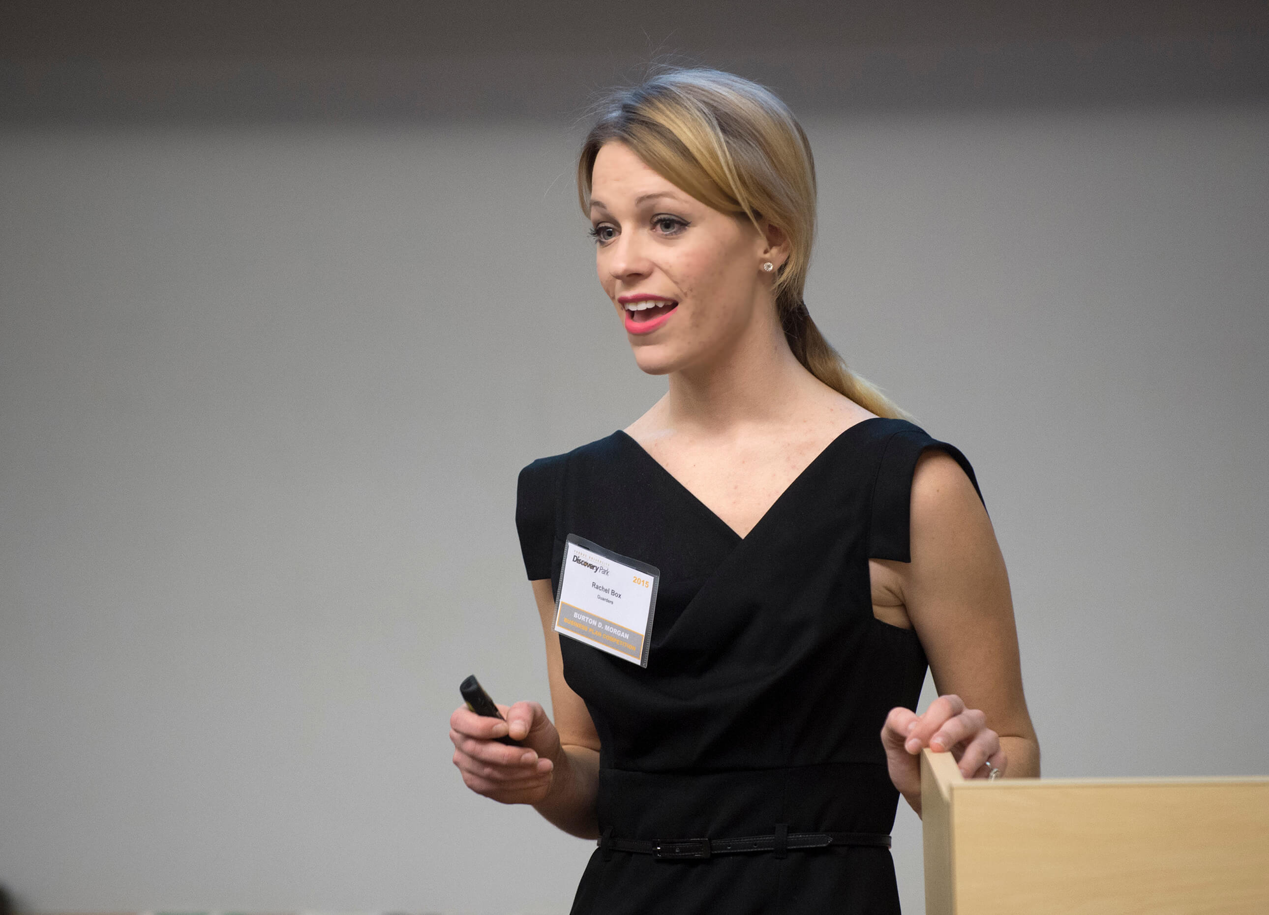 Rachel Box, an apparel design and technology major, took Black Division top honors for Guarders, which is developing a shapewear garter with pockets integrated in its inseam to give women the ability to unobtrusively carry their phone, key, credit cards, ID and other personal belongings. The 28th annual Burton D. Morgan Business Plan Competition on Tuesday (Feb. 17) featured 10 finalists in two divisions, narrowed from an initial 85 applicants since November. (Purdue University photo/Mark Simons) |