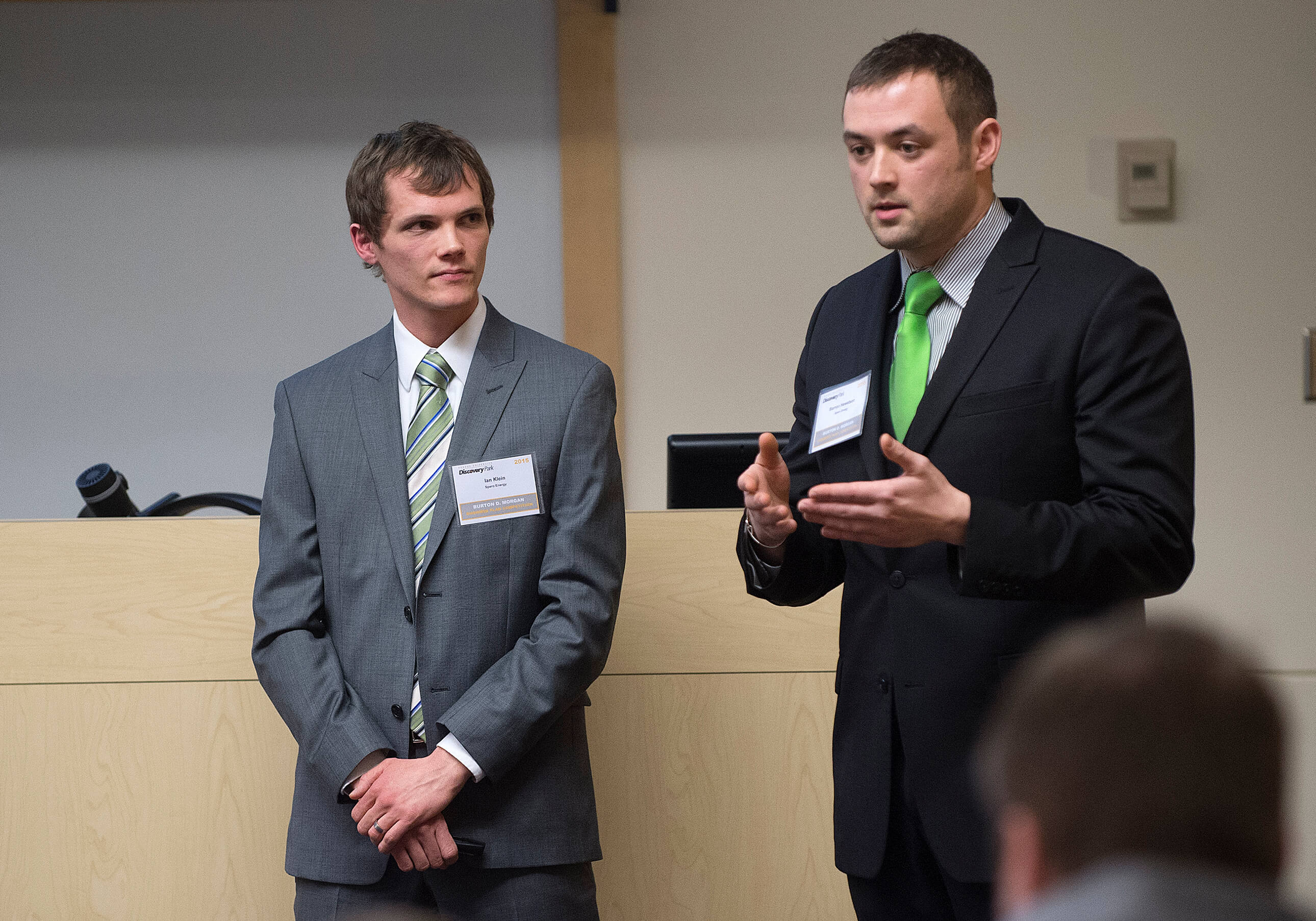 The business plan presented on Spero Energy Inc. by Ian Klein and Barron Hewetson took the $30,000 top prize in the Gold Division for graduate students at the 28th annual event, which was held in the Burton D. Morgan Center for Entrepreneurship in Discovery Park. Spero is developing a one-step selective lignin conversion technology that could revolutionize the biorefinery industry.