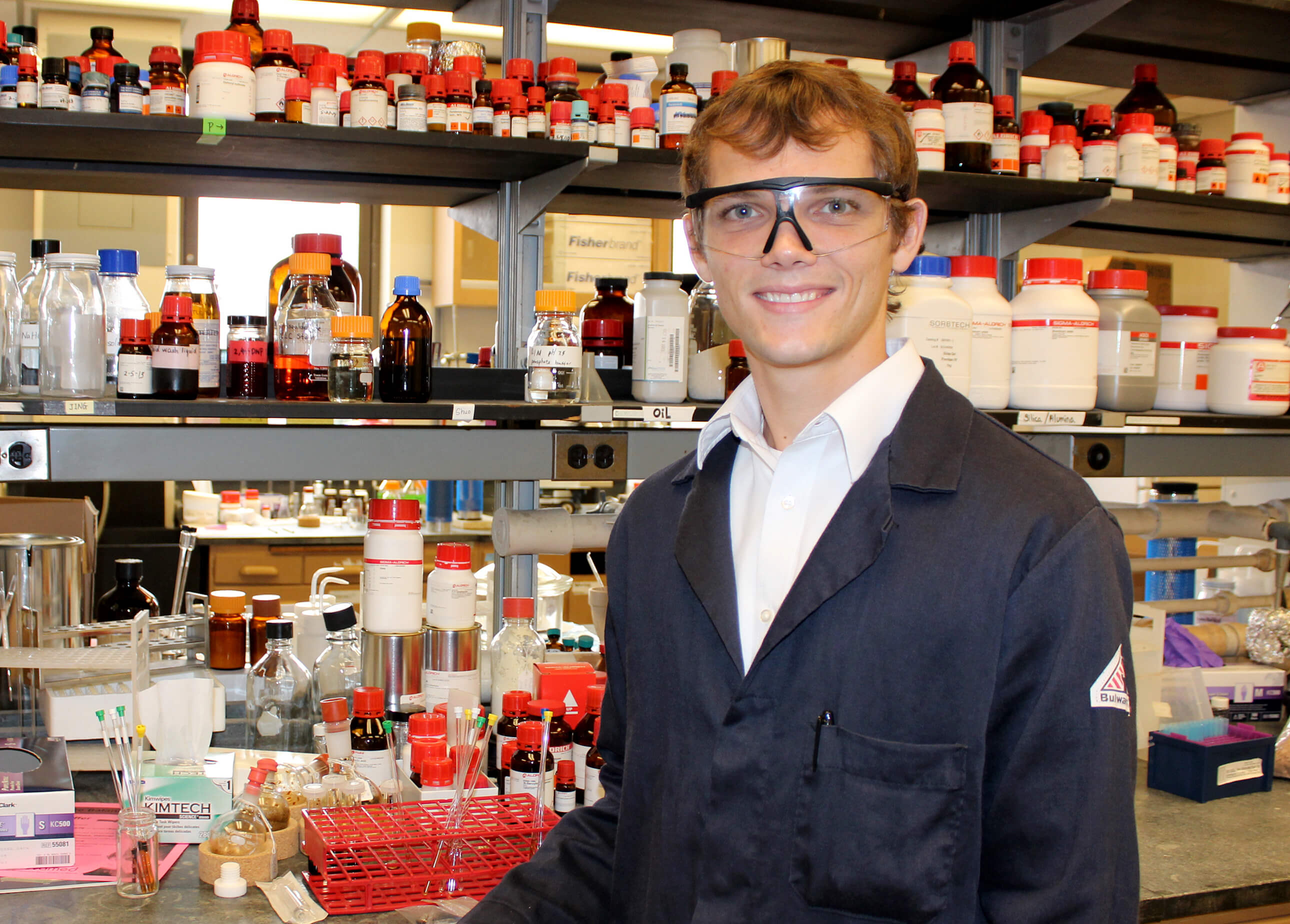 Ian Klein, a graduate student in the Purdue College of Science's Department of Chemistry, was recognized by Forbes magazine for his work with a team of Purdue researchers who founded Spero Energy Inc., a company that is commercializing technology that creates high-value, renewable chemicals used in the flavor and fragrance industry. (Purdue Research Foundation photo) |