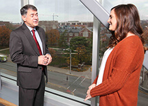 Freddie Barnard, the 2015 recipient of the Frederick L. Hovde Award of Excellence in Education Service to the Rural People of Indiana, talks with Purdue University animal sciences student Ashley Bowerman. (Purdue Agricultural Communication photo/Tom Campbell) |