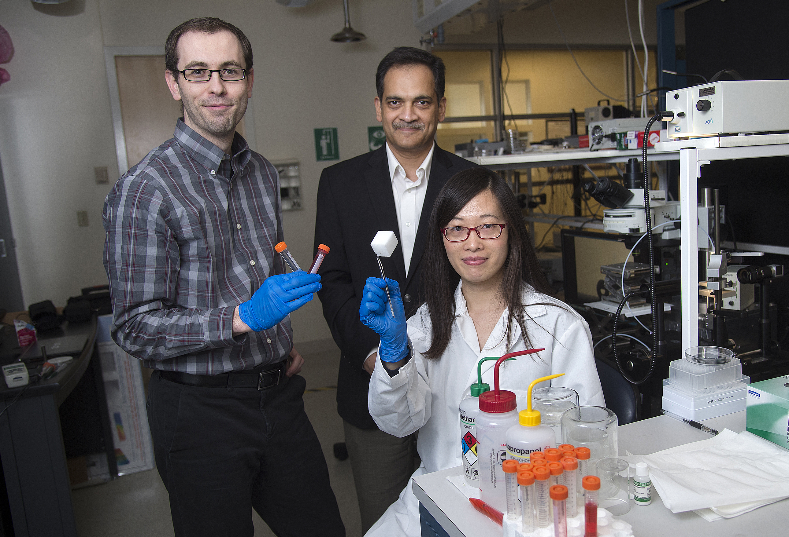 Purdue University researchers have developed a technology for removing oils and other pollutants from water by modifying commercially available melamine sponges, representing a potential tool for environmental cleanup. From left are research assistant professor of mechanical engineering Justin A. Weibel, Suresh Garimella, executive vice president for research and partnerships and the Goodson Distinguished Professor of Mechanical Engineering, and postdoctoral research associate Xuemei Chen. (Purdue University photo/Mark Simons) |