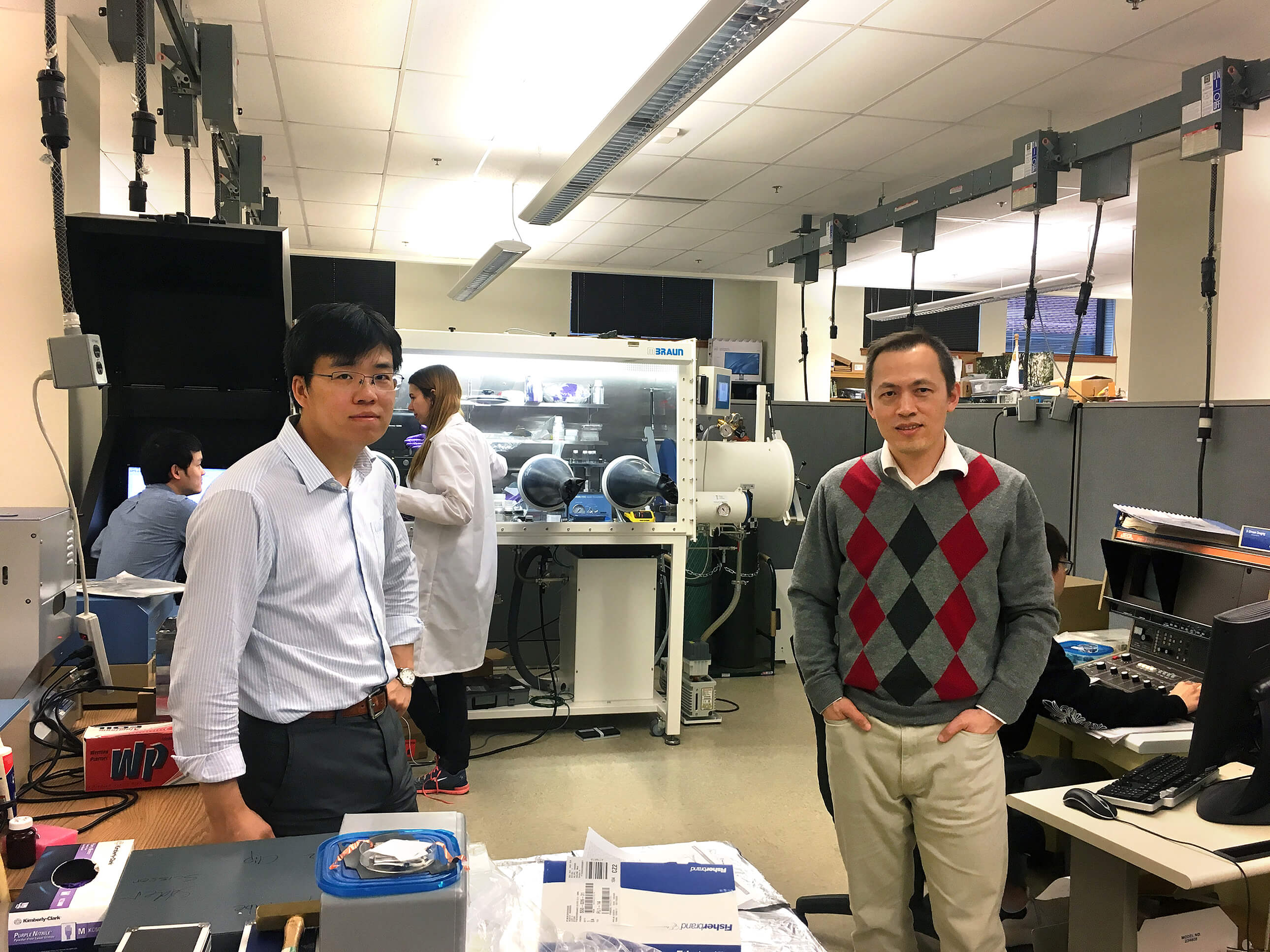 One of the six Purdue interdisciplinary projects receiving $450,000 in funding through the U.S. Navy Enterprise Partnership Teaming with Universities for National Excellence (NEPTUNE) program focuses on efforts using nanotechnology for developing lithium-ion batteries. This team is led by mechanical engineering professor Kejie Zhao (left) and industrial engineering professor Gary Cheng. Joining them in Cheng's research laboratory in the A.A. Potter Engineering Center are (from left) are mechanical engineering doctoral students Rong Xu and Luize Vasconcelos, and Yang Ding, an undergraduate student also in mechanical engineering. (Purdue University photo/provided)