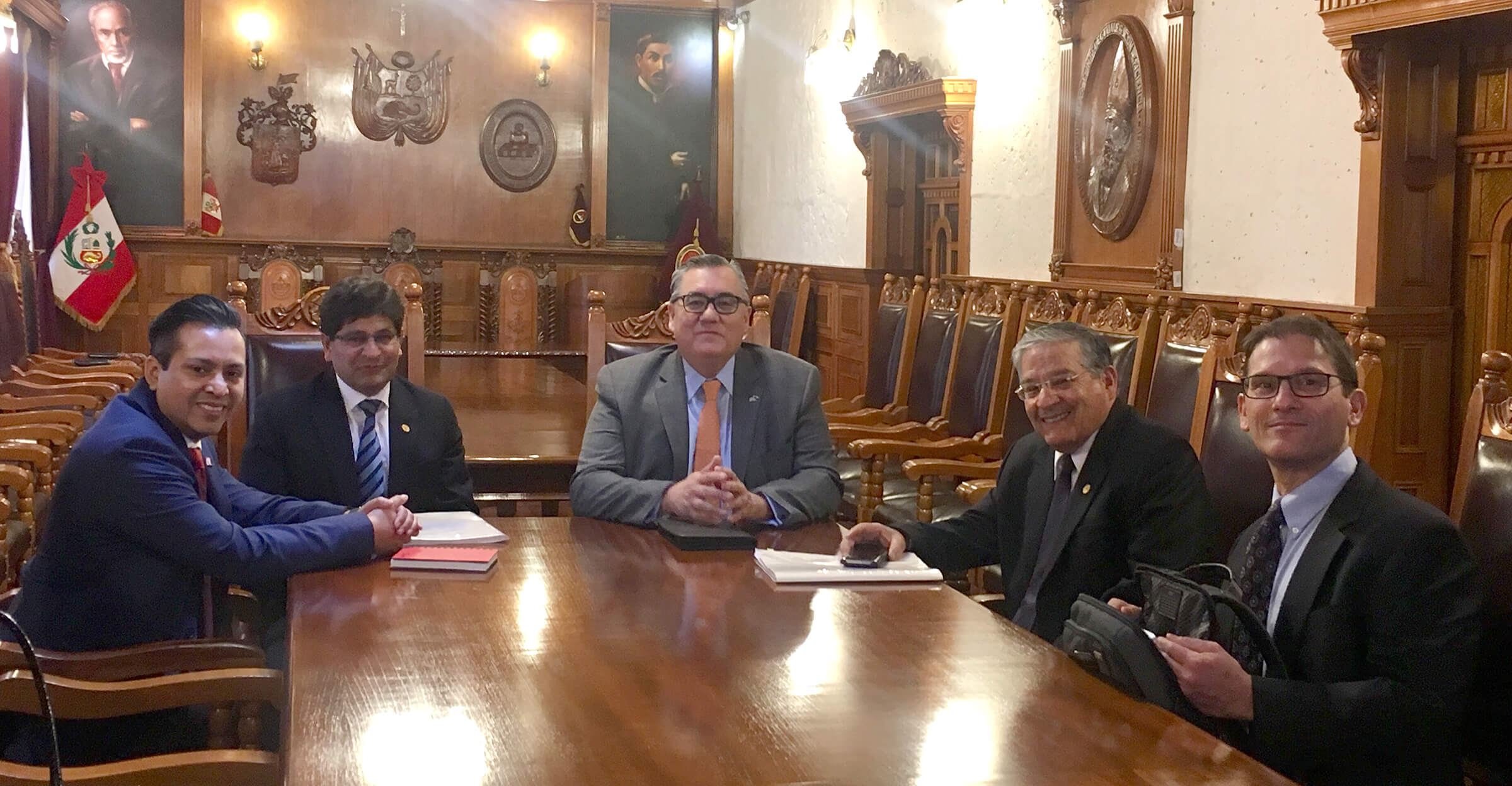Representatives from Purdue, UNSA and Core Foundation met at the Universidad Nacional San Agustín in Arequipa, Peru. From left are Ricardo Torreblanca, Core Foundation president; Rohel Sánchez Sánchez, UNSA rector; Tomás Díaz de la Rubia, chief scientist and executive director of Discovery Park; Horacio Barreda Tamayo, UNSA vice rector for investigation; and Tim Filley, Purdue professor of earth, atmospheric and planetary sciences and agronomy. (Photo courtesy of Paola Torreblanca-Fischer, Core Foundation, vice president)
