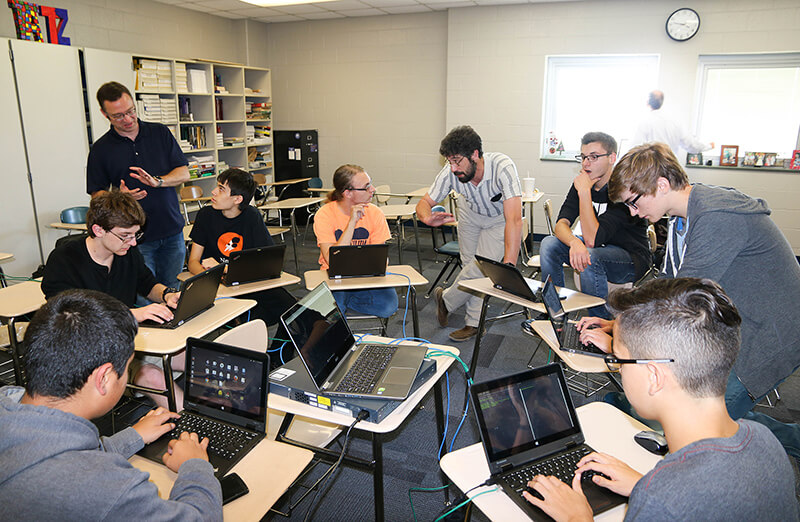Purdue research computing staff members Chuck Schwarz and Lev Gorenstein (standing) work with members of Harrison High School's student supercomputing team (clockwise, from lower left: Eduardo Butron, Nick Nolte, Jeremy Meyer, Chris Page, Jacob Sharp, Callum Gundlach, and Nick Frooninckx)