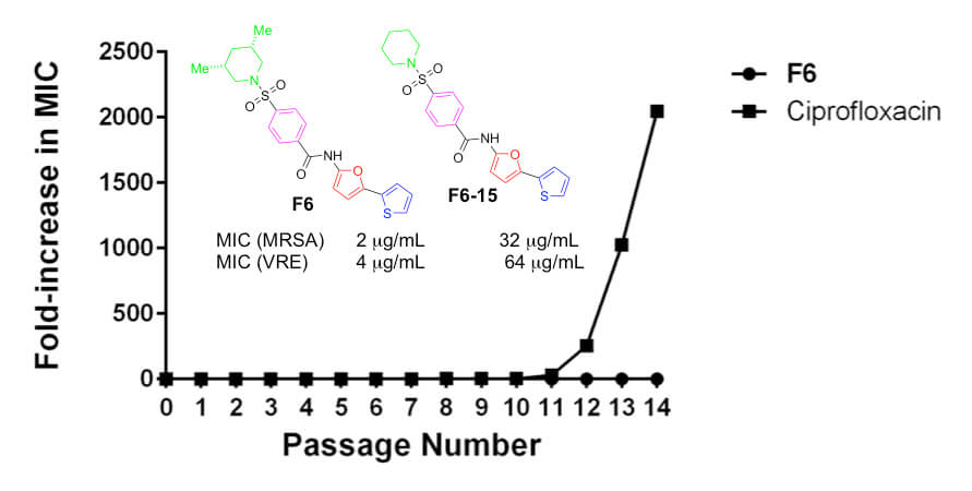 Purdue researchers identified F6 by screening a chemical library for compounds with antibacterial activity. They tried to force bacteria resistance on F6, performing experiments to evaluate the ability of MRSA USA400 to develop resistance to F6 in vitro.
