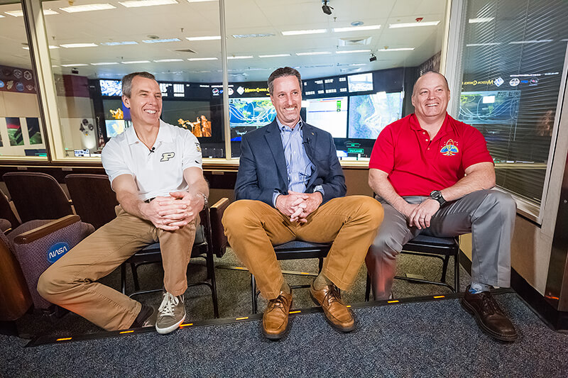 astronauts-group Astronaut Drew Feustel, flight director Gary Horlacher, and astronaut Scott Tingle sit in mission control. All three are Purdue graduates and work for NASA. Feustel and Tingle recently spent time on the International Space Station. (Purdue University photo/Trevor Mahlmann) Download image