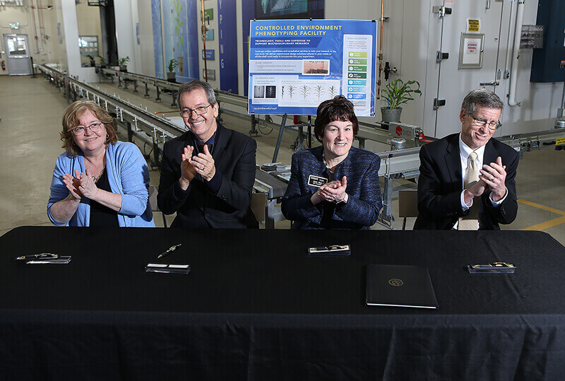 From left are Connie McManus Pimentel, director of international relations for the Brazilian agency CAPES; Mauro Rabelo, Brazilian national secretary for higher education; Karen Plaut, the Glenn W. Sample Dean of Purdue Agriculture; and Dan Hirleman, Purdue's chief corporate and global partnerships officer, after signing the new CAPES-Purdue Agriculture Ph.D. Fellows agreement at the Controlled Environment Phenotyping Facility.