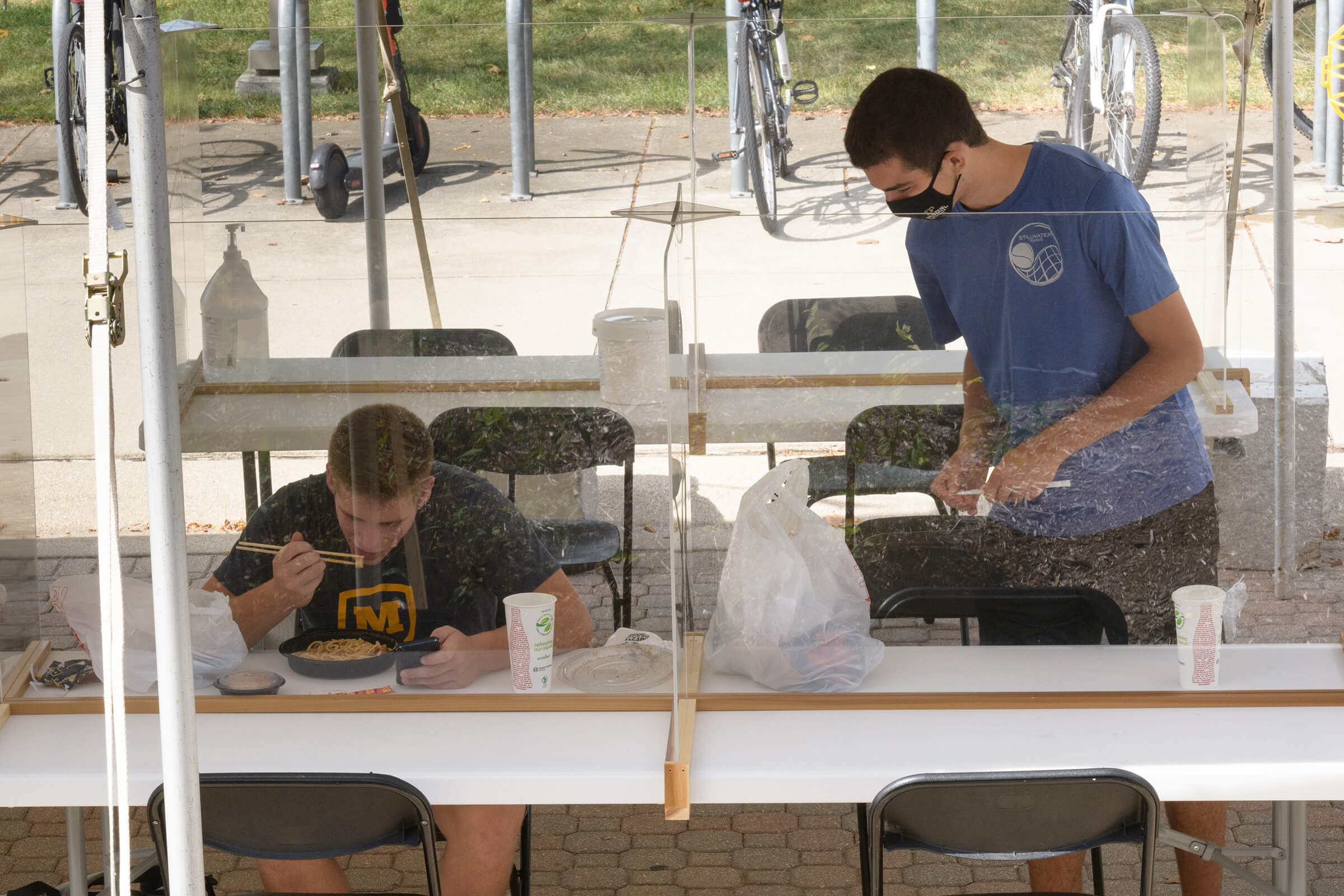 To be safe and considerate of others, outdoor tent users are asked to clean their area with disinfectant wipes before and after use, and to use hand sanitizer as needed, said Ryan Gallagher, senior director of Facilities Operations at Purdue. Custodians disinfect the tables and plexiglass barriers in the tents each night.