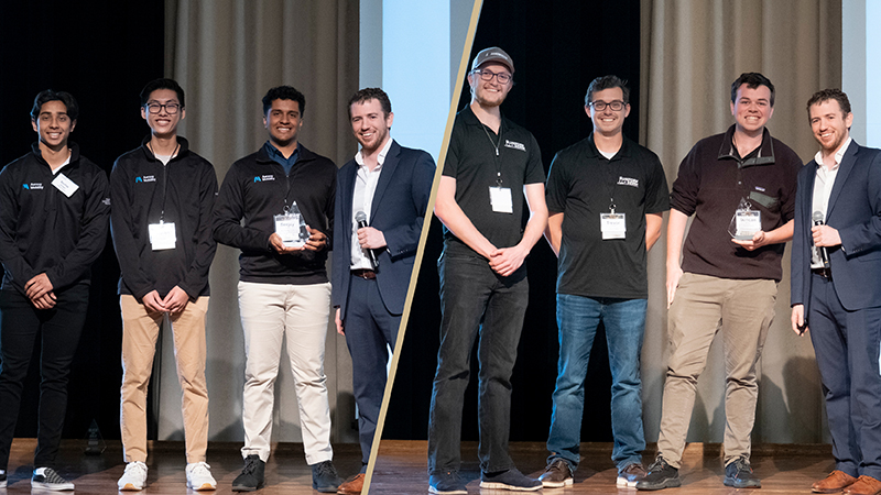 Purdue University alumni-led startups Aerovy Mobility, in left photo, and Uniform Sierra Aerospace participated in the biannual Black and Gold Awards pitch competition. Purdue Innovates Startup Foundry, led by Tyler Mantel (at far right in both pictures), awarded $100,000 apiece to both companies. Aerovy Mobility also received $40,000 from the New Venture Challenge pitch competition, managed by the Purdue Innovates Incubator. (Purdue University photo/Vincent Walter)