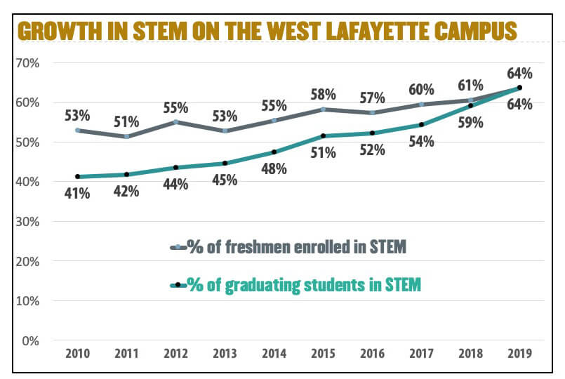 [i] Purdue consistently ranks among the top three most STEM-centric research universities in the country. Since 2013, our freshmen studying STEM have grown from 53 percent to 64 percent.