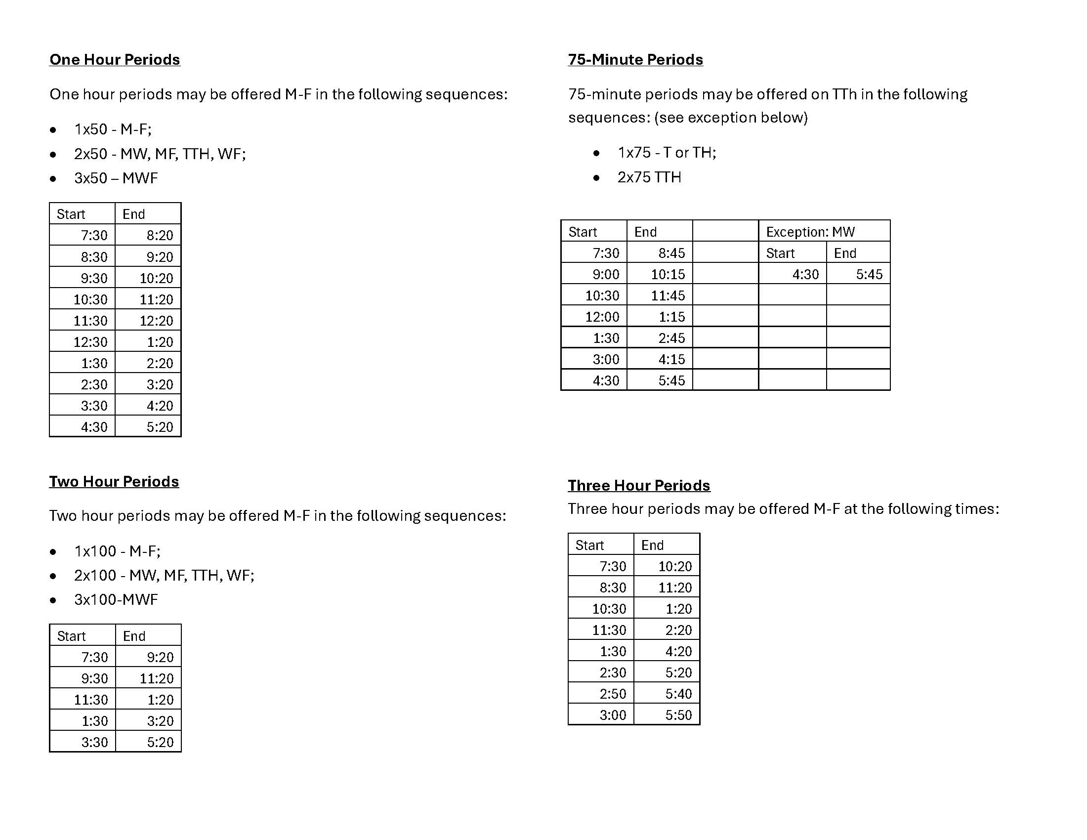 The following time sequences are to be used in planning the Schedule of Classes. Requests for exceptions must be approved by the Dean and the Provost and require a letter submitted via the Office of the Registrar at schedule planning time each semester, indicating the need.