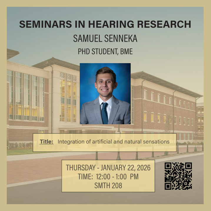 On Thursday, January 22 at 12:00-1:00 PM in SMTH 208, Samuel Senneka (PhD Student, BME) will present “Integration of artificial and natural sensations” for the Seminars in Hearing Research seminar series. See the attached flyer for details, and please note the room change!