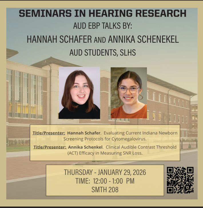 On Thursday, January 29 at 12:00-1:00 PM in SMTH 208, the Seminars in Hearing Research seminar series will feature two AUD EBP talks by current SLHS AUD students: “Evaluating Current Indiana Newborn Screening Protocols for Cytomegalovirus” by Hannah Schafer, and “Clinical Audible Contrast Threshold (ACT) Efficacy in Measuring SNR Loss” by Annika Schenkel. See the attached flyer for details, and please note the room change!