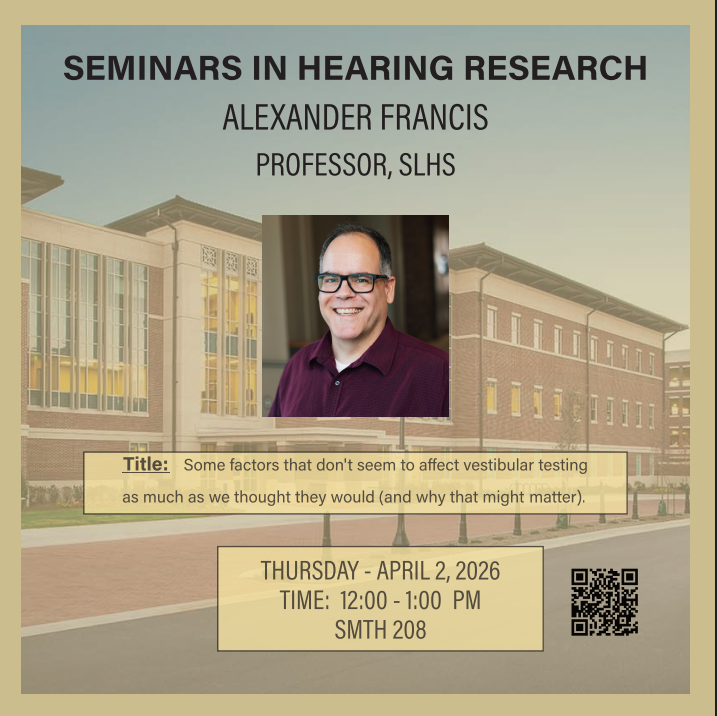 On Thursday, April 2 at 12:00-1:00 PM in SMTH 208, Dr. Alexander Francis (Professor, SLHS) will present “Some factors that don’t seem to affect vestibular testing as much as we thought they would (and why that might matter)” for the Seminars in Hearing Research seminar series. See the attached flyer for details!