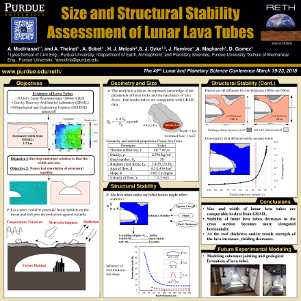 Theinat, A., Modiriasari, A., Bobet, A., Melosh, H.J., Dyke, S.J., Ramirez, J., Maghareh, A., Gomez, D. Geometry and Structural Stability of Lunar Lava Tubes, in AIAA conference - 2018, Orlando, Florida, Sept-2018.