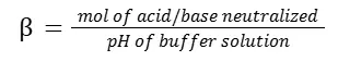 - Calculate the ratio of (moles of added acid neutralized) to (moles of base component in the buffer). Do the same calculation for (moles of added base neutralized) to (moles of acid component in the buffer). Use the equivalence points of both titration graphs to determine the total moles of acid and base that were neutralized.