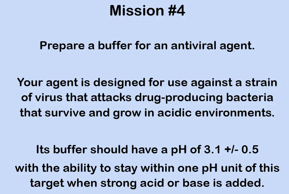Scenario 4: Prepare a buffer for an antiviral agent which is designed for use against a strain of virus that attacks drug-producing bacteria that survive and grow in acidic environments. This buffer should have a pH of 3.1 ± 0.5 with the ability to stay within one pH unit of this target when strong acid or base is added.