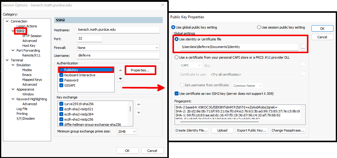Open a quick connect window (Under “File” or Alt-Q). Under Authentication highlight PublicKey, then click the Properties button.