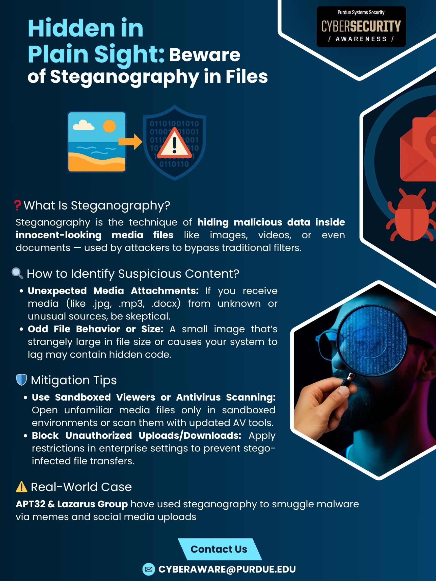 Steganography hides malware in innocent-looking files like images or audio. Attackers use it to bypass security filters. Opening such files can trigger hidden code. To stay safe, scan files with antivirus tools, avoid suspicious downloads, and use deep file inspection. Awareness is crucial to defend against these hidden threats.