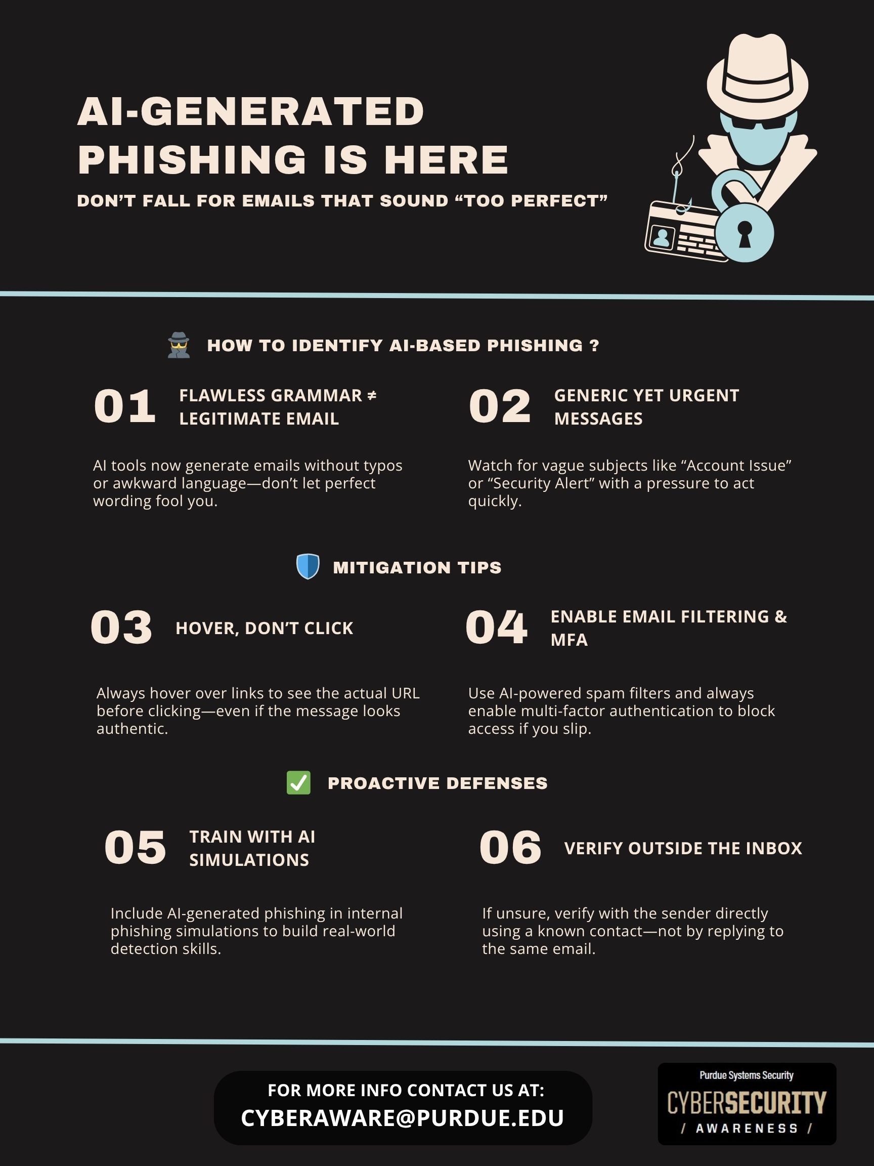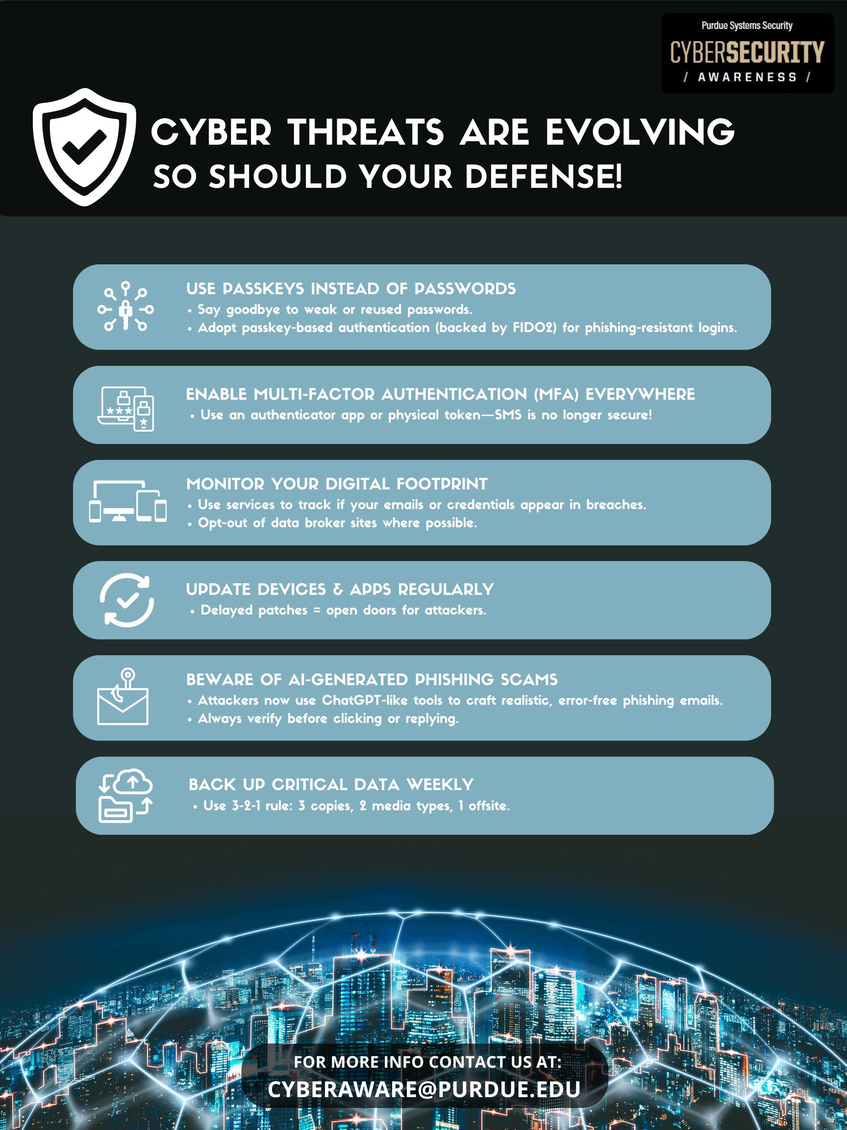 Welcome to the Cybersecurity Updates page—your monthly hub for the latest security alerts, awareness campaigns, and digital safety tips curated by Purdue IT.Stay ahead of emerging threats and learn how to protect your data, devices, and identity. This page is updated regularly with new content, so check back often or subscribe to stay informed!