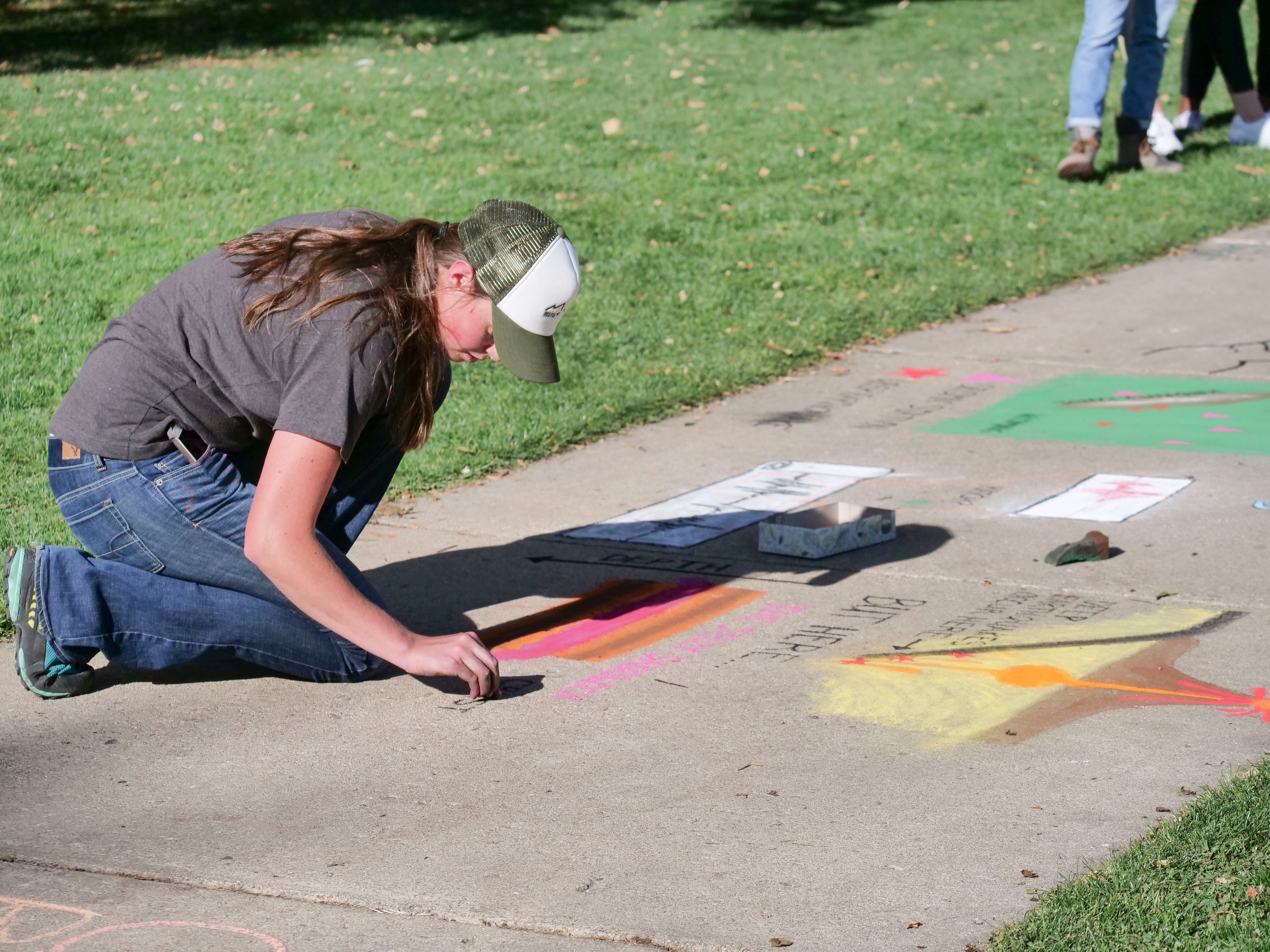 Scholarship in Chalk invites undergraduates to display their research and creative projects with chalk on campus walkways. This event highlights student projects while promoting creative and visual storytelling.