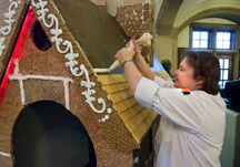 Nothing says Christmas quite like an edible house. That is the philosophy of Purdue Memorial Union's Dining Services, which began constructing gingerbread houses in 2002. The giant, walk-in homes are displayed prominently next to the Christmas tree in the Union's Great Hall as part of Holidays at the Union, which takes place this week. A photo gallery featuring the construction of this year's house is available here. The PMU maintenance department constructs and dismantles the house, which is made out of plywood. After the house is built, the gingerbread, which takes the bakery department about two weeks to make, is adhered to the plywood with royal icing. A graham cracker roof is tiled on top, and then the designers are free to have fun. More