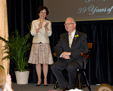 A reception was held Friday to honor John Sautter, Purdue's vice president for housing and food services, who will retire June 30 after serving nearly four decades at the University. Under Sautter's leadership, Purdue's housing and food service operations have been guided by a series of master plans that have broadened student housing options and transformed on-campus dining. In the photo, President France A. Córdova congratulates Sautter as he tries out his Purdue rocking chair, a traditional gift given to exceptional Boilermakers upon retirement.