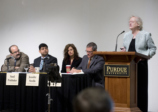 Thursday's President's Forum focused on two of the new Purdue Moves initiatives -- expanding the College of Engineering and strengthening computer science. The forum featured opening remarks by President Mitch Daniels and presentations by Leah Jamieson, the John A. Edwardson Dean of Engineering; Pedro Irazoqui, director of the Center for Implantable Devices and associate professor of biomedical engineering and electrical and computer engineering; Sunil Prabhakar, professor and head of the Department of Computer Science; and Jennifer Neville, associate professor of computer science and statistics. A streaming archive of the President's Forum is available here, and additional information is available at the Purdue Moves website.