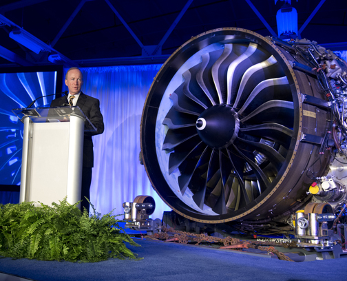 President Mitch Daniels speaks at a ceremony Wednesday (March 26) to announce that GE Aviation will break ground this year on a new $100 million jet engine assembly facility in Lafayette. The 225,000-square-foot facility will assemble the new LEAP engine from CFM International, a 50/50 joint company between Snecma (Safran) and GE.