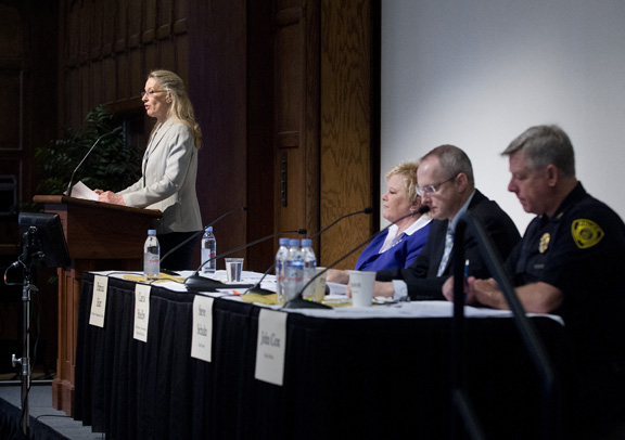 Patricia Hart, chair of the emergency preparedness and security feedback panel, talks about the panel's final report Wednesday (April 30) at the President's Forum. Hart was joined by panel members (from left) Carol Shelby, senior director of environmental health and public safety; Steve Schultz, legal counsel; and John Cox, chief of police.