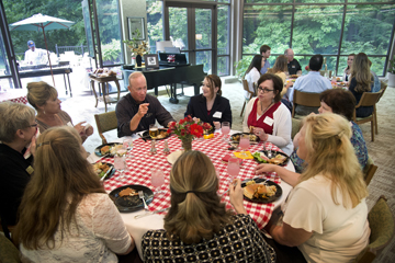 On Thursday (June 19), President Mitch Daniels hosted members of the Administrative and Professional Staff Advisory Committee (APSAC) and the Clerical and Service Staff Advisory Committee (CSSAC) at Westwood, the Purdue presidential residence, where they enjoyed a cookout. Here, Daniels and several members of the committee savor the meal and engage in conversation. (Purdue University photo/Mark Simons)