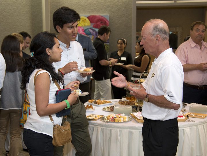 President Mitch Daniels talks with Colombian exchange students Maroly Yohana Gomez Hermosa and Camilo Alberto Cordon Duarte on Monday (June 23) during a reception at Westwood. Twenty-six top undergraduate students from Universidad Nacional de Colombia will be spending up to six months at Purdue learning from research to gain experience they can apply to their work back home. The visit is the result of a partnership, started in 2010, between Purdue and the government of Colombia that created the Colombia-Purdue Institute, designed to enhance the scientific and entrepreneurial workforce in the South American nation. (Purdue University photo/Mark Simons)