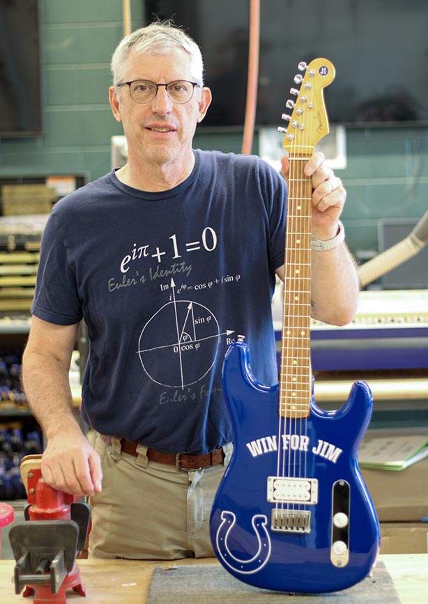 A custom guitar designed in Purdue’s Guitar Lab by professor Mark French and Noah Scott is helping the Colts honor late owner Jim Irsay. Commissioned by head coach Shane Steichen, the guitar was completed in less than a month with help from Lafayette community partners. Presented to Irsay’s daughters before the Sept. 7 home opener, the guitar will be carried into every Colts game this season in his memory.