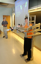 Kara Dailey of Crothersville, Ind., demonstrates a "mechanically enhanced man" or MEM, designed and built by a team of about 20 Purdue University students. Fellow student Kyle Zeller of Zionsville, Ind., looks on. The aluminum exoskeleton is about 6 and a half feet tall and would enable the average person to lift and move objects weighing 300 pounds. When completed, the machine's driver will use a joystick to move the arms and legs, which receive their strength from eight motors powered by two large batteries. Dailey participated in a senior design course in which students created the machine under the supervision of mechanical engineer John Nolfi, manager of the university's Product Engineering and Realization Laboratory. The rigorous class is a so-called "capstone" courses that prepare students for jobs in corporate America. "The projects in these courses require you to be an engineer, as opposed to a student," Nolfi said. (Purdue University News Service Photo by Dave Umberger) A publication quality photograph is available at ftp://ftp.purdue.edu/pub/uns/nolfi.mem.jpeg Related information is available at |