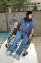Jun-Min Teh, assistant project engineer for the Purdue University School of Mechanical Engineering senior design class, demonstrates the "assisted entertainment vehicle" prototype, which is designed to allow people in wheelchairs better access to amusement park rides. Chuck Flueck, left, who initially proposed the idea after serving an internship with a Walt Disney Co. subsidiary, operates a lift to show the wheelchair's lock-in stability. Twenty-five students in the class designed, built and tested the vehicle and a docking device interface during their eight-week summer class that is just ending. The Americans with Disabilities Act (ADA) requires theme parks to make 20 percent of their rides handicap accessible. "Our goal was to create a method that allows the user to access rides by themselves with maximum dignity," said class instructor John Nolfi, manager of the university's Product Engineering and Realization Laboratory in the School of Mechanical Engineering. Companies have already expressed interest in the method's commercial possibilities, he said. (Purdue News Service Photo by David Umberger) A publication-quality photograph is available at ftp://ftp.purdue.edu/pub/uns/nolfi.prototype.jpeg |