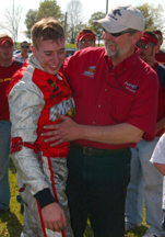Nathan O'Rourke, a junior from Muncie, Ind. who is majoring in mechanical engineering, finished second. Kasick finished third. Victor Garcia, a senior from Ecuador majoring in horticulture, finished fourth; Nicholas Watt, a senior from Naperville, Ill. majoring in mechanical engineering technology and representing the Delta Chi fraternity finished fifth. Thirty-three Purdue students competed in the event. The flag was waived after Jeff Serrano, a junior majoring in mechanical engineering technology from North Pole, Alaska, lost control of his kart, which flipped over the bales. Serrano managed to escape injury. O'Brien reclaimed the lead in lap 92 and held on to secure the victory in the 50-mile, 160 lap race. The Purdue Grand Prix Foundation is a student-run, nonprofit organization that conducts the kart race and related events to raise money for student scholarships. The foundation awarded 18 scholarships totaling more than $5,000 in the 2002-03 school year. The foundation receives support from Ford Motor Co., Coca Cola Co. the Kimberly-Clark Corp. and Purdue Intercollegiate Athletics. CONTACT: Scott Ripberger, Grand Prix president (765) 494-2708, scottierip@hotmail.com Timothy O'Brien, (765) 495-5921, tobrien@purdue.edu Purdue News Service: (765) 494-2096; purduenews@purdue.edu PHOTO CAPTION: Timothy O¹Brien receives a congratulatory hug from his father, Mike O'Brien, after successfully defending his title in the Purdue Grand Prix kart race. O¹Brien, a sophomore majoring in mechanical engineering technology from Lebanon Ohio, was in contention for most of the race and led the final 68 laps. Thirty-three Purdue students competed in the 46th annual event today (Saturday, 4/26) on Purdue's West Lafayette campus. The Purdue Grand Prix Foundation is a student-run, nonprofit organization that conducts the race and related events to raise money for student scholarships. (Purdue News Service Photo by David Umberger.)