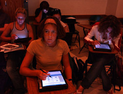 "In my view, tablet PC technology is the bridge between laptops and personal digital assistants," said Howard Sypher, head of the communication department and an expert in communication and technology. "I see these devices, especially when used in a wireless environment, as incredibly versatile and potentially revolutionary in their ability to shape the learning environment. Purdue graduates will see and use these types of devices in every technological field. It's great that our students will experience the strengths and weaknesses of tablet PCs just as they are being broadly developed." Professor Melanie Morgan's "Presentational Speaking," an honors class of 22 first-year students, is one of the first to use the Toshiba tablet PC, which are about the size of a flat-screen computer monitor. More than 40 tablets will be distributed to communication students and faculty to check out for the semester. Information Technology at Purdue (ItaP) provided the funds for the tablets PCs, which are portable PCs of about the size of a paper notebook. "The tablet PCs offer speech students immediate feedback," Morgan, an assistant professor of communication, said. "For example, as soon as a student finishes a speech in class, he or she can receive evaluations from classmates who have heard the speech. The tablet PCs also can be linked to PowerPoint software. "I expect students also will suggest their own interesting ways to use the tablet PCs," said Morgan, who also will use the technology to archive her students' speeches, thanks to a grant from ItaP. The devices also are being used in upper-level undergraduate courses such as "Communication and Emerging Technologies," "Public Affairs Reporting" and other journalism-related courses for student research and virtual teamwork projects. "Students can use these devices in many areas of journalistic data gathering and integration," Sypher said. "When reporters interview sources, they can take notes on the tablet, while collecting audio and capturing photos directly to the device." A graduate student is conducting a usage study of the devices, which features monitoring software, and is surveying users to determine the value of tablet PCs in communication classes. Sypher said that these devices will be deployed in other communication and journalism questions, including a special study-abroad class in Italy. "With the tablets students can do their own work, communicate with friends back in the U.S., work in teams and develop Web-based projects, and keep journals while abroad," Sypher said. Morgan and Sypher will attend the National Communication Association annual meeting in November in Miami Beach where they will direct a short course on "Using New Technologies in Instruction and Research." This course will highlight the department's use of tablet PCs and handheld personal digital assistants for instructional purposes. Toshiba also will provide PCs for course participants to work with. Purdue's Department of Communication has approximately 1,300 undergraduate majors and 125 graduate students. The department offers classes in pubic relations, video production, organizational communication, telecommunications, rhetoric, journalism and interpersonal communication. The "Fundamentals of Speech Communication" is one of the largest basic communication courses in the country, Sypher said. Nearly 8,000 Purdue students take the course each year. Writer: Amy Patterson-Neubert, (765) 494-9723, apatterson@purdue.edu Sources: Howard Sypher, (765) 494-3300, HSypher@sla.purdue.edu Melanie Morgan, (765) 494-3305, melanie.morgan@sla.purdue.edu