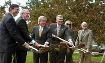 Purdue University broke ground today on the Bindley Bioscience Center, a $15 million facility for research in the life sciences. The building, for which half the funding was donated by entrepreneur William Bindley, will form part of Purdue's Discovery Park, which will facilitate interdisciplinary work in the sciences and engineering. Pictured (from left) at the ceremony are: Charles Rutledge, executive director of Discovery Park; J. Timothy McGinley, chairman of Purdue's Board of Trustees; Bindley; Purdue President Martin Jischke; Mrs. Mary Ann Bindley; and Graham Cooks, Henry Bohn Hass Distinguished Professor of Analytical Chemistry.