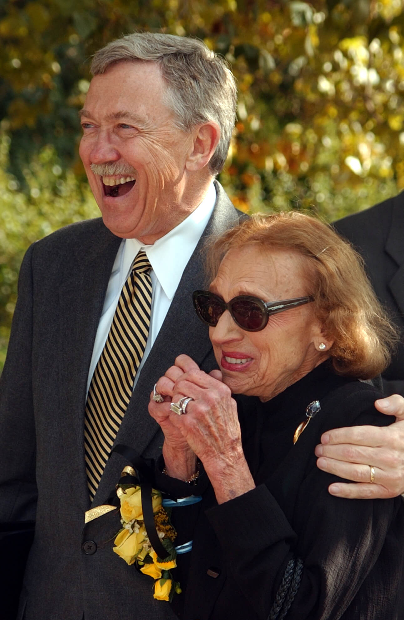 Purdue President Martin C. Jischke embraces Heddy Kurz as Purdue's "All American" Marching Band serenades her. Kurz and her late husband, Herman, a 1925 Purdue graduate, bequeathed $2 million toward the construction of a new building that will house the Department of Computer Sciences. The couple also has given $800,000 for the purchase and maintenance of instruments for the band. (University News Service photo/David Umberger)