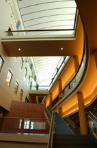 An interior view of Jerry S. Rawls Hall, the Krannert School of Management's new facility, which was dedicated today (Thursday, 10/2). The $35 million, 128,000 square-foot, four-story building, which is technologically state-of-the-art with Internet- and videoconference-enabled classrooms, also is equipped with wireless access points throughout the building. (Purdue News Service photo/David Umberger)