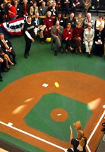 Jerry S. Rawls threw out the first pitch at the "Opening Day" dedication today (Thursday, 10/2) of Jerry S. Rawls Hall, the Krannert School of Management's new facility. The $35 million facility, built completely with private funds, opened for classes this fall. Catching Rawls' pitch is Leighann Burke, a pitcher for the Purdue softball team from Lafayette, Ind., who will graduate from the Krannert School in May 2004. (Purdue News Service photo/David Umberger)