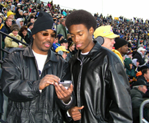 Mark Thompson, a freshman at Arlington High School who participates in Purdue University's Science Bound program, watches as his uncle, Matt Thompson, checks out e-Stadium at a Purdue football game. A personal digital assistant prototype developed at Purdue, e-Stadium allows football fans to score up-to-the-minute statistics, review player and coach biographies, and answer trivia questions. (Photo courtesy of Science Bound director Wesley Campbell.)