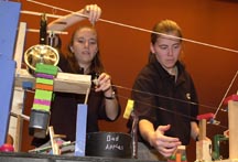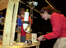 Debra Klein, a senior from Wood Dale, Ill., and Lindsay Elliot, a sophomore from West Lafayette, Ind., reset the Society of Women Engineers' machine during Saturday's Purdue University Rube Goldberg Machine Contest. Last year's defending champions placed third in the 2001 competition and used the theme "Willy Wonka and the Chocolate Factory" to complete the task, which was to select, clean and peel an apple. (Purdue University News Service Photo by David Umberger) A publication-quality photograph is available at the News Service Web site and at the ftp site. Photo ID: Rubelocal2.2001