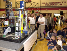 "The Big Apple" machine used items such as a golf ball painted like a Harlem Globetrotters' basketball that bounced from a trampoline to a basketball hoop, a figure of King Kong climbing the Empire State Building, a pool ball rolling across the Brooklyn Bridge and a jet flying out of LaGuardia Airport. Music, including the Globetrotters theme, "New York, New York," "The Heart of Rock and Roll" and "Arthur's Theme," was timed to accompany the machine's progress. In addition to Gossman, the winning team members were: Brandon Fruechte, a senior mechanical engineering major from Decatur, Ind.; Andy G. Jahn, a senior in mechanical engineering technology from St. Anthony, Ind.; Josh Hurst, a senior in mechanical engineering technology from Lafayette, Ind.; Mark Pund, a senior in mechanical engineering technology from Ferdinand, Ind.; Judson Tyler Brown, a junior in computer integrated manufacturing technology from Bloomington, Ind.; Patrick J. Webber, a senior in mechanical engineering technology from Floyds Knobs, Ind.; Michael Wehr, a senior in building construction management from Huntingburg, Ind.; and Beau G. Wendholt, a senior in mechanical engineering technology from Ferdinand, Ind. The second-place trophy and $300 went to the University of Toledo. Third place and $100 went to University of Texas at Austin for a James Bond themed machine called "Goldberg, Rube Goldberg." "The Big Apple" was selected as the People's Choice Award winner by the more than 300 people attending the competition at West Lafayette High School's gymnasium. Other entries were from first-time competitors University of Buffalo, with a "Death by Pokeman" machine, and Vanderbilt University, with a Snoopy-themed machined called "V-squared Peanut Gallery." Also at the competition was a team of physics students from Plainfield High School in Plainfield, Ill. Theta Tau fraternity invited the students to make an exhibition run of their machine, which won first place in the Chicago regional Rube Goldberg competition. The high school team, last year's Illinois state champions, will defend their title at the Illinois state competition on May 2. The Purdue team dedicated more than 700 man-hours working on its machine since November. Gossman said the most difficult part of creating the machine was dreaming up the steps. The contest is sponsored by Purdue's Theta Tau fraternity with support from Purdue Music Organizations and financial support from Newark Electronics and Dell Computer Corp. Source: Eric Gossman, Society of Manufacturing Engineer team member, (765) 464-3437 Writer: Bob Johnson, (765) 496-7704, bobwjohnson@purdue.edu Other source: Fernando Cordero, contest chairman, (765) 743-2623, fcordero@purdue.edu Related Web sites: PHOTO CAPTIONS: A publication-quality photograph is available at the News Service Web site and at the ftp site. Photo ID: Rubenat01.jpeg